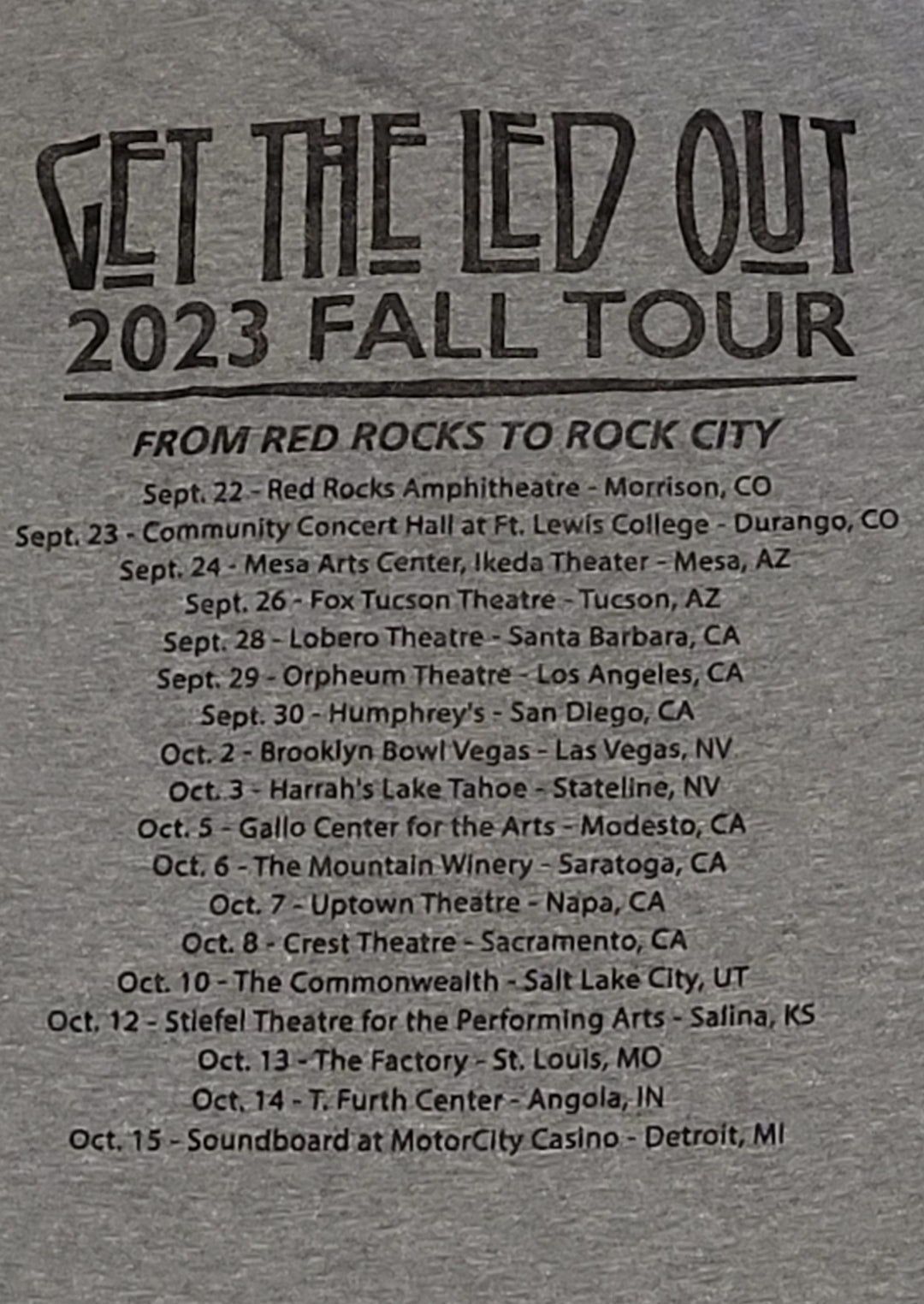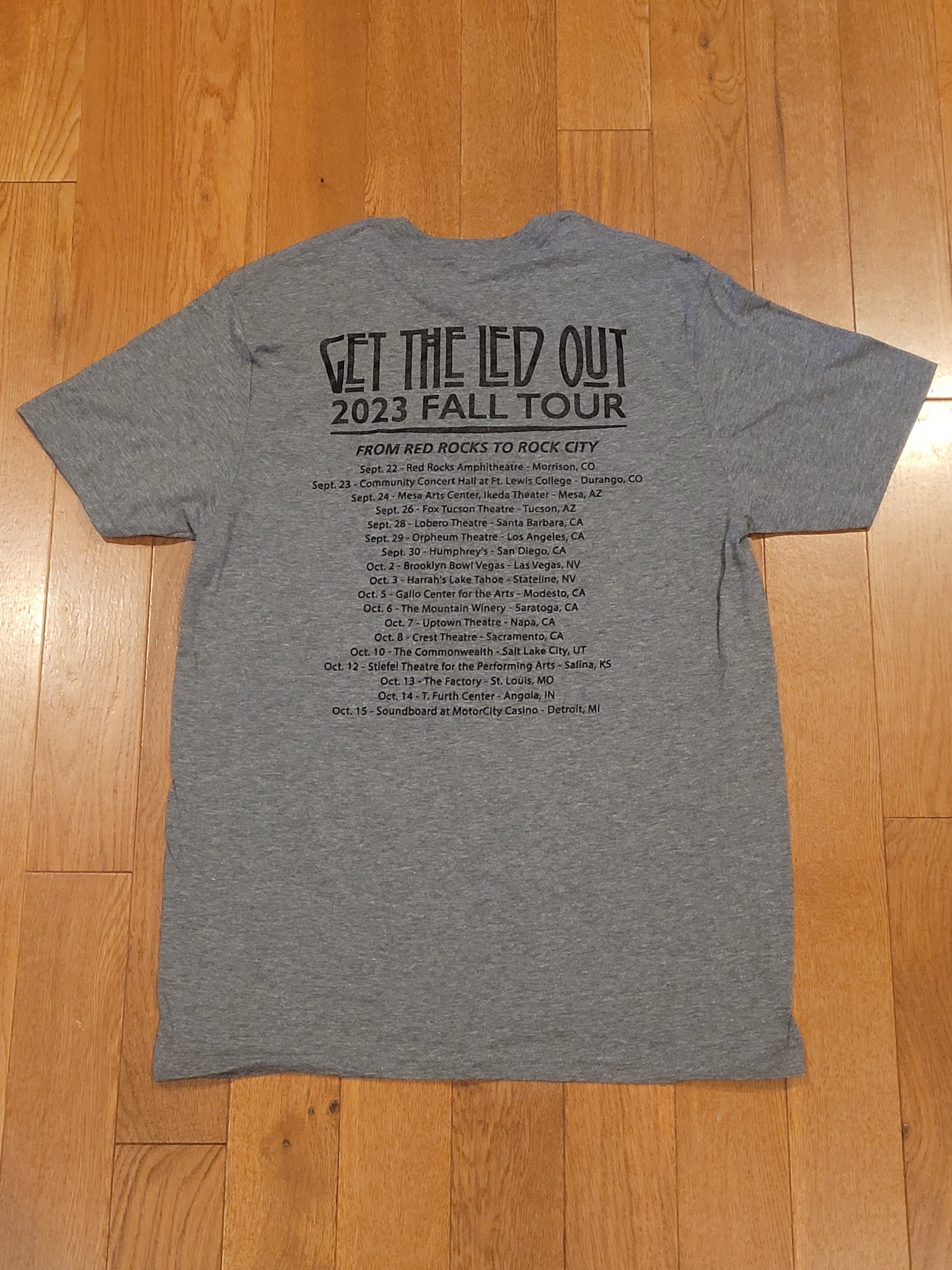 Heather gray shirt which shows the individual silhouettes of all the band members and their notorious stage poses. This shirt features the Fall 2023 Tour stops.