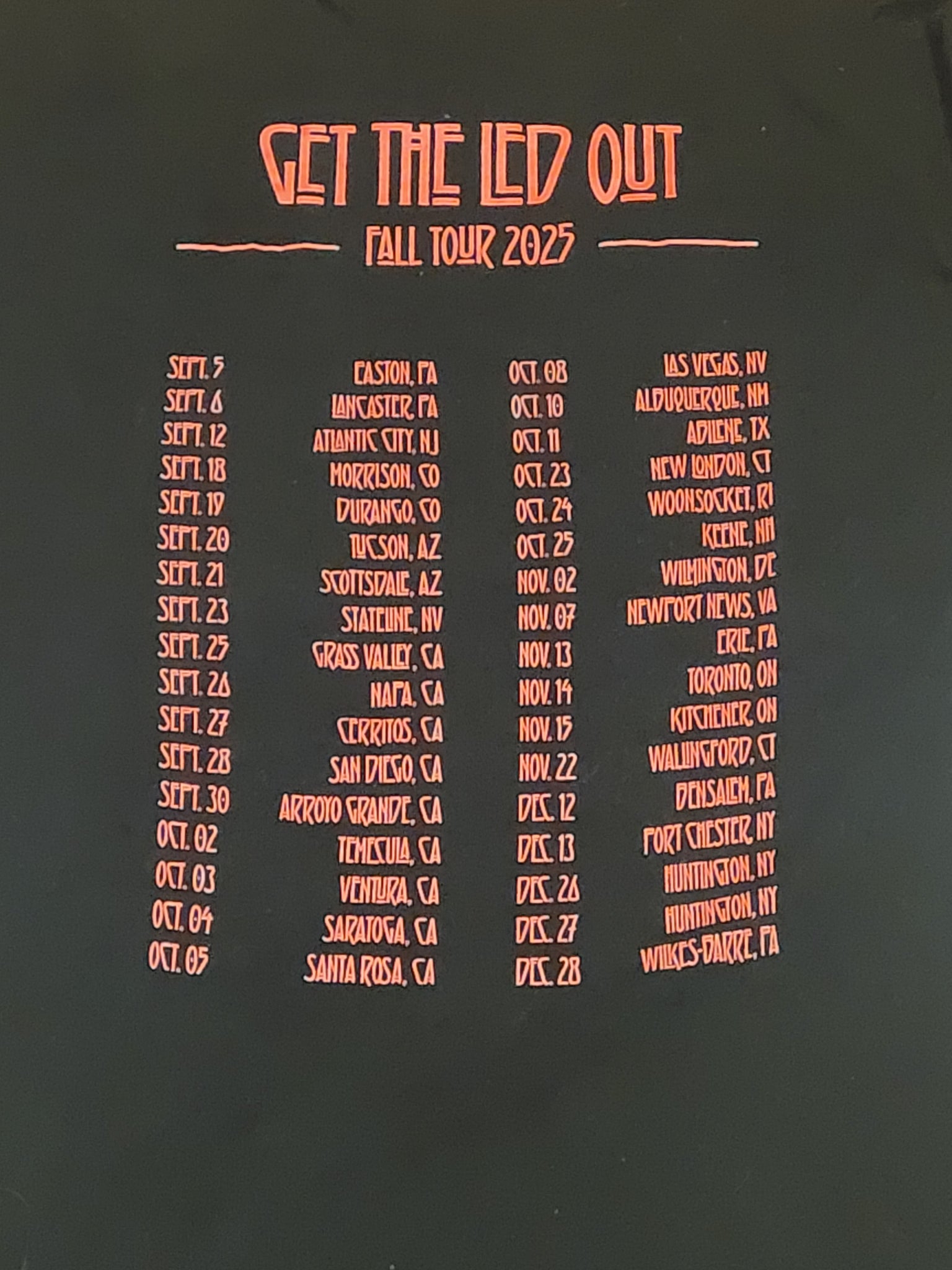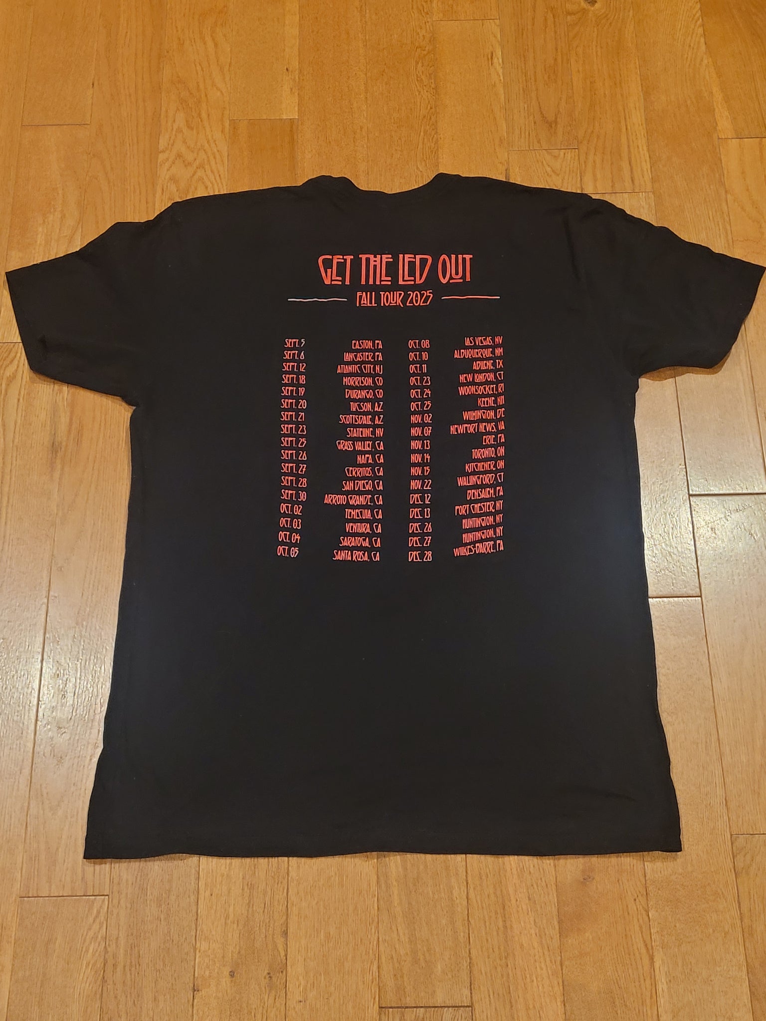 This is our first tour shirt that features not just a single tour, but the last quarter of the year...allowing all our east coast fans and the inbetween to own a shirt with their town name on it.